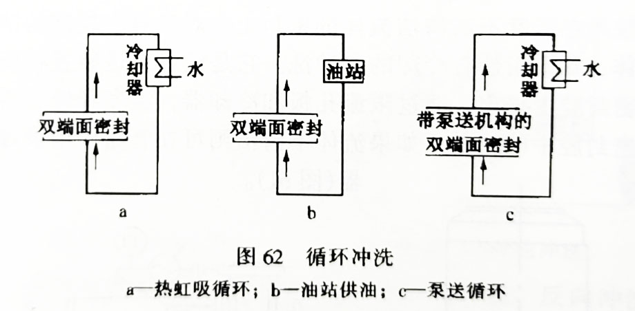 循環(huán)沖洗是經(jīng)過一個泵送裝置使外加的密封流體進行循環(huán)(圖62)。這里有兩點需要引起留意,一是“泵送裝置”,可以是外加的油站和密封腔形成閉合回路進行循環(huán),也可在密封腔中裝設(shè)一個泵,或者是用熱虹吸的原理使流體循環(huán)。另一點要留意的是“外加的密封流體”。這種沖洗方法用在雙端面或多端面密封上,在單端面密封上不選用。循環(huán)沖洗也有人稱為“外循環(huán)”。
