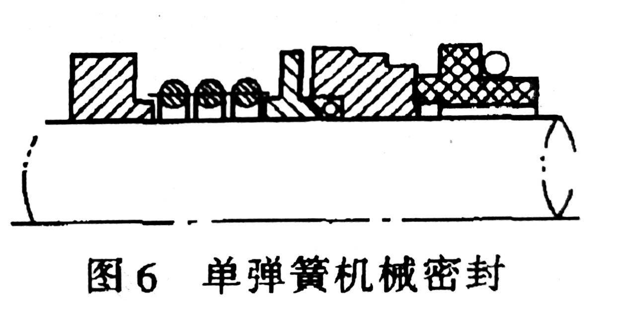 按補償結(jié)構(gòu)中彈簧的數(shù)量可分為多彈簧和單彈簧機械密封。補償結(jié)構(gòu)中有多個彈簧的密封稱為多彈簧機械密封(圖5);補償結(jié)構(gòu)中只有一個彈簧的機械密封稱為單彈簧機械密封(圖6)。多彈簧機械密封又稱小彈簧機械密封,這種結(jié)構(gòu)軸向長度較小,可用更改彈簧數(shù)量的辦法調(diào)節(jié)彈性力大小,軸向力較均勻,適用于高速機械密封,在腐蝕性介質(zhì)中不宜采用。單彈簧機械密封又稱大彈簧機械密封,密封結(jié)構(gòu)較為簡單。有的密封型式還用彈簧傳遞扭矩。國產(chǎn)密封應(yīng)用大彈簧較多,但不能用于高速。