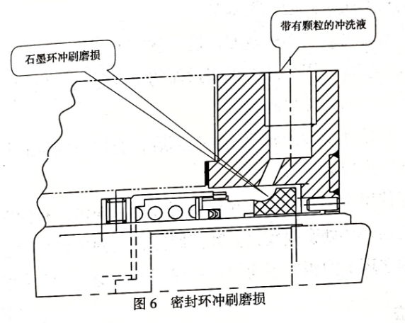 ◆原因分析過高的沖洗速度或沖洗孔的位置不當,以及沖洗液中含有顆粒都可能使密封環(huán)受到?jīng)_刷磨損(圖6)。