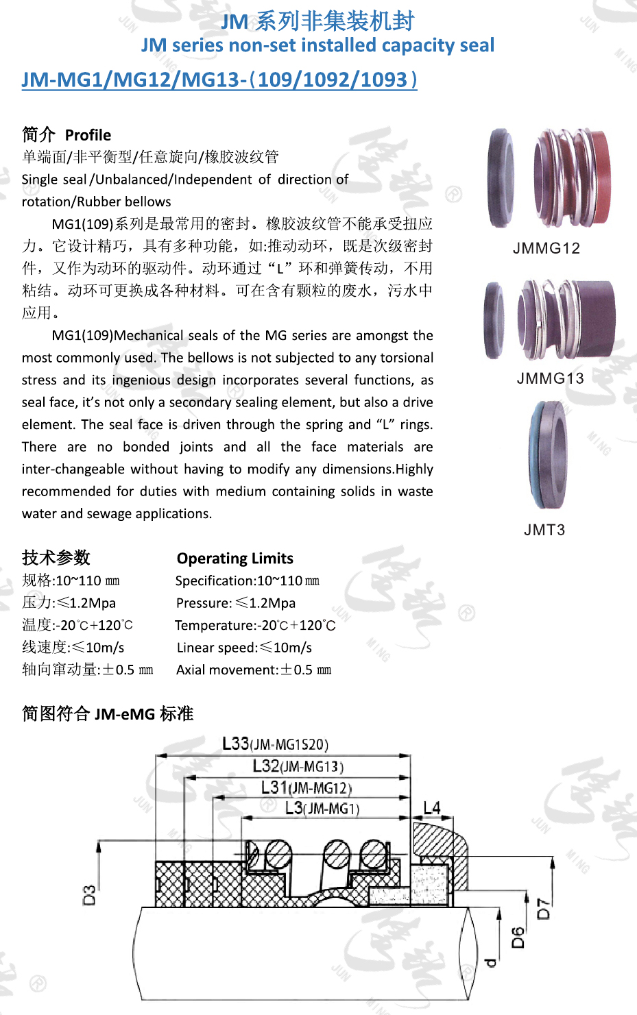 MG1(109)系列是最常用的密封。橡膠波紋管不能承受扭應(yīng)力。它設(shè)計精巧,具有多種功能,如:推動動環(huán),既是次級密封件,又作為動環(huán)的驅(qū)動件。動環(huán)通過“L”環(huán)和彈簧傳動,不用粘結(jié)。動環(huán)可更換成各種材料。可在含有顆粒的廢水,污水中應(yīng)用。