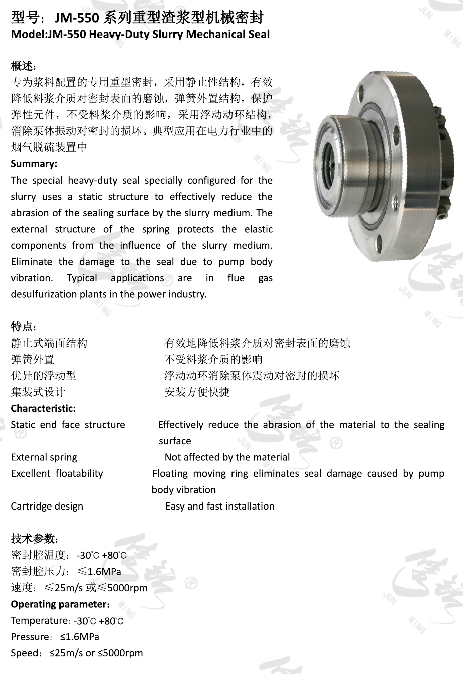 專(zhuān)為漿料配置的專(zhuān)用重型密封,采用靜止性結(jié)構(gòu),有效降低料漿介質(zhì)對(duì)密封表面的磨蝕,彈簧外置結(jié)構(gòu),保護(hù)彈性元件,不受料槳介質(zhì)的影響,采用浮動(dòng)動(dòng)環(huán)結(jié)構(gòu),消除泵體振動(dòng)對(duì)密封的損壞。典型應(yīng)用在電力行業(yè)中的煙氣脫硫裝置中