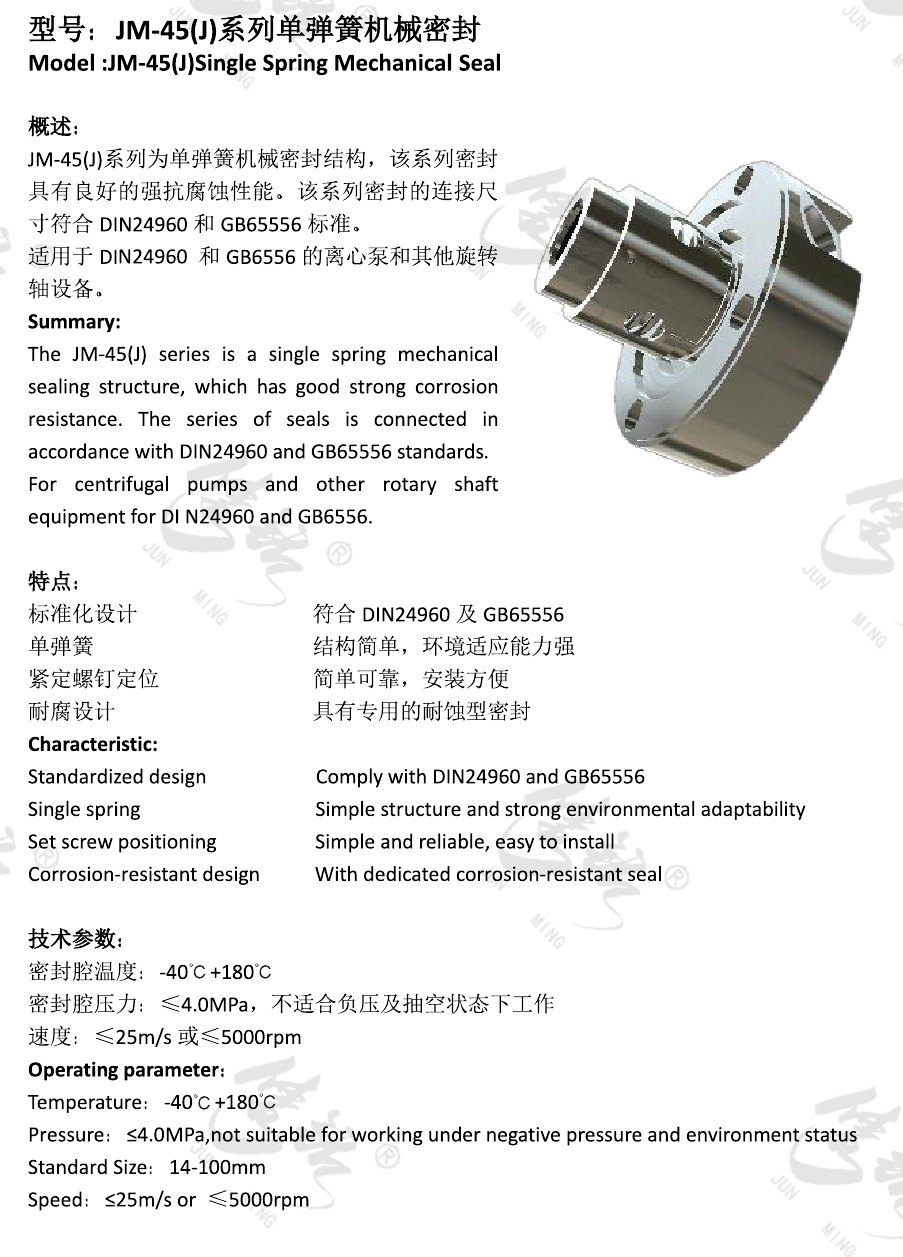 JM-45(J)系列為單彈簧機械密封結(jié)構(gòu),該系列密封具有良好的強抗腐蝕性能。