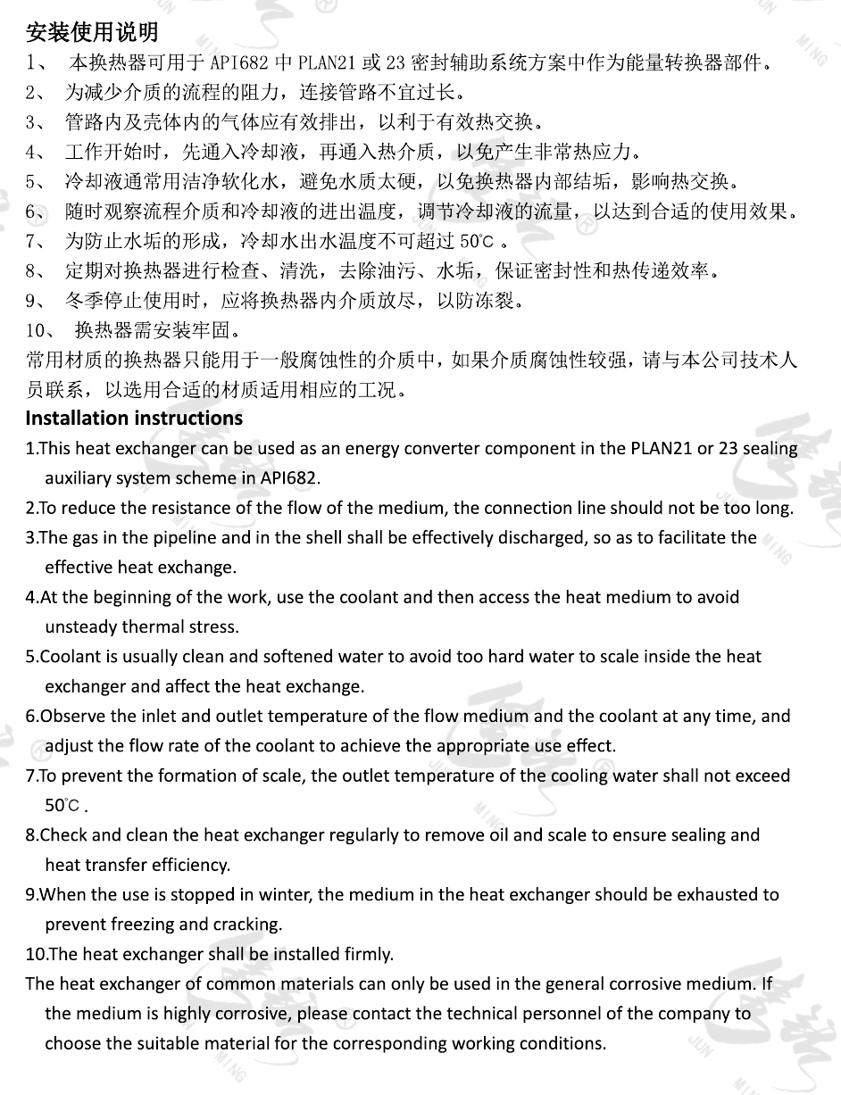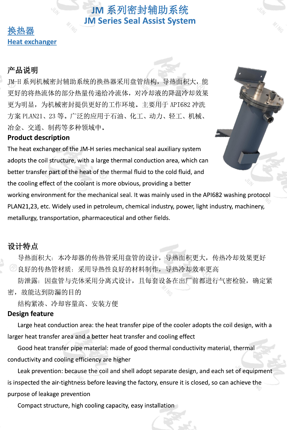 JM-H系列機械密封輔助系統(tǒng)的換熱器采用盤管結(jié)構(gòu),導(dǎo)熱面積大,能更好的將熱流體的部分熱量傳遞給冷流體,對冷卻液的降溫冷卻效果更為明顯,為機械密封提供更好的工作環(huán)境。主要用于API682沖洗方案PLAN21、23等。廣泛的應(yīng)用于石油、化工、動力、輕工、機械、冶金、交通、制藥等多種領(lǐng)域中。